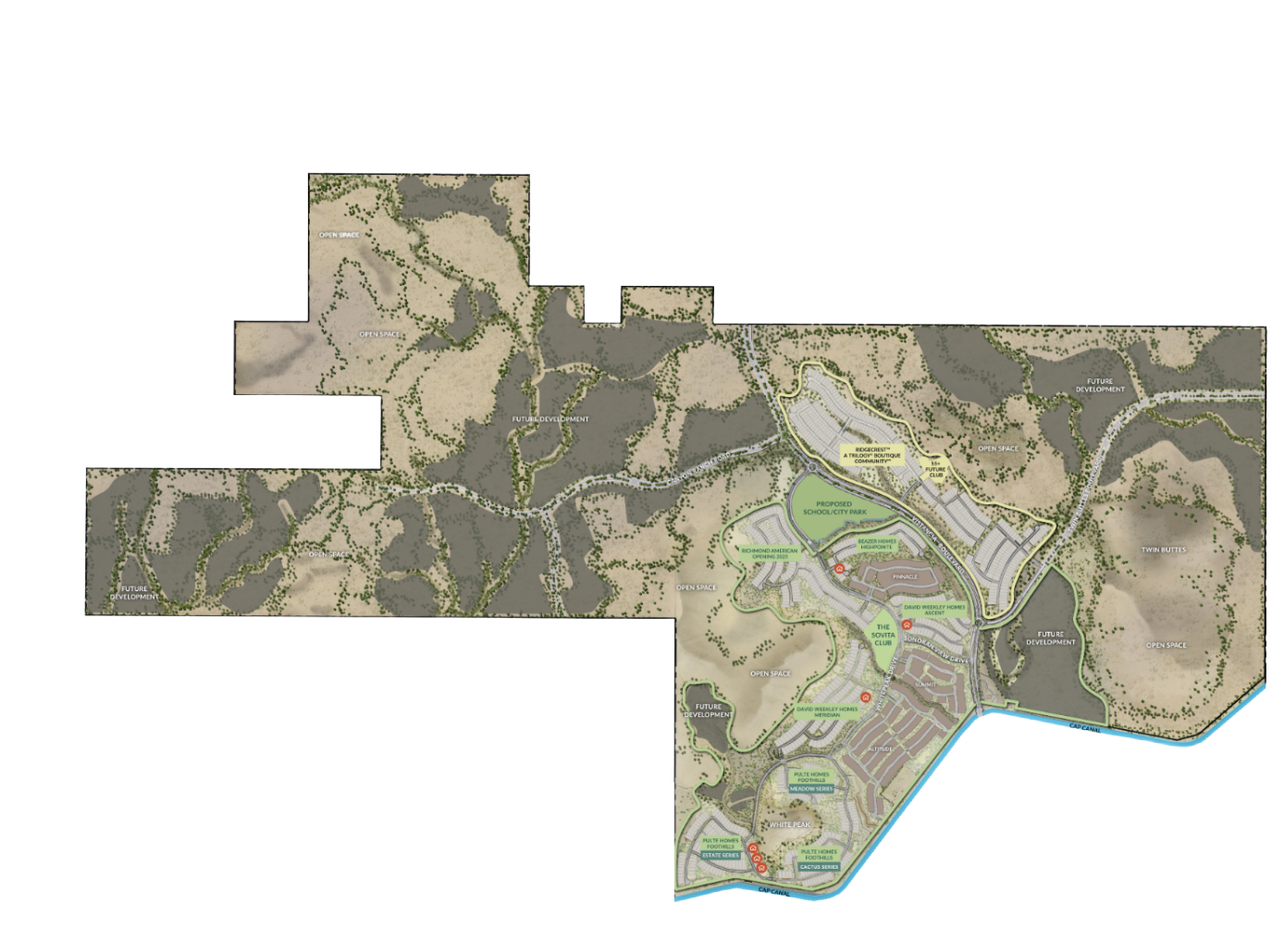 Spanning 3,450 acres and prominently situated amongst the most elevated and mountainous land within the Vistancia master planned community, Northpointe at Vistancia features epic panoramic mountain views, serene desert surroundings, and dramatic dark skies. Nestled between the White Peak and Twin Buttes mountains, Northpointe is planned for 3,250 homes upon completion includes a diverse selection of homes, private recreation centers, community parks, a proposed K-8 elementary school, and approximately 1,100 acres of mountain preserve, and hiking and walking paths.
