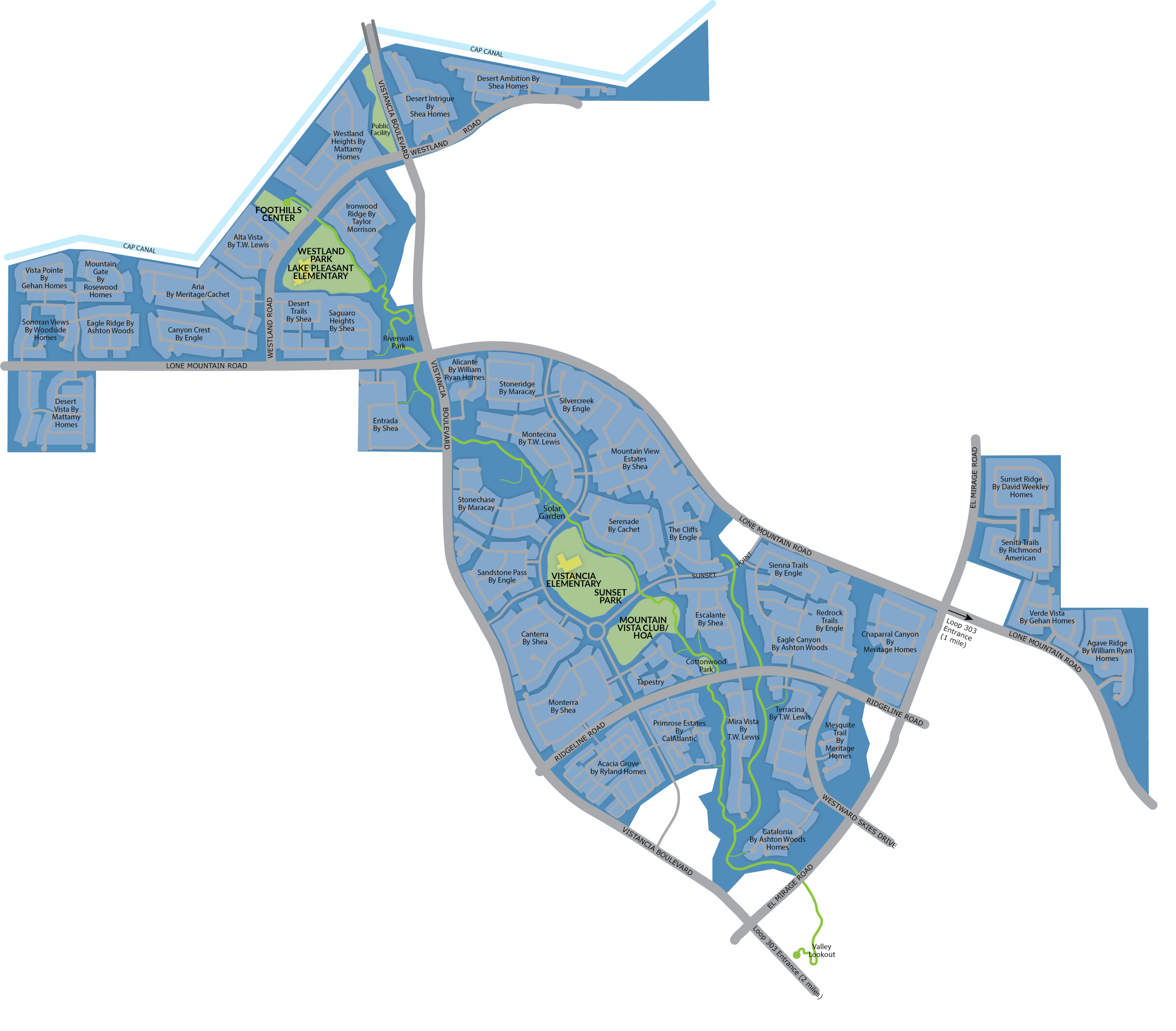 Located within the award-winning Vistancia master planned community, The Villlage at Vistancia community offers family-friendly, multi-generational living with resort-style amenities and year-round activity. The Village includes two recreation centers, the Mountain Vista Club and the Foothills Center with pools, waterslides, an indoor basketball gymnasium, lighted tennis courts, a game lawn, and year-round events and activity.